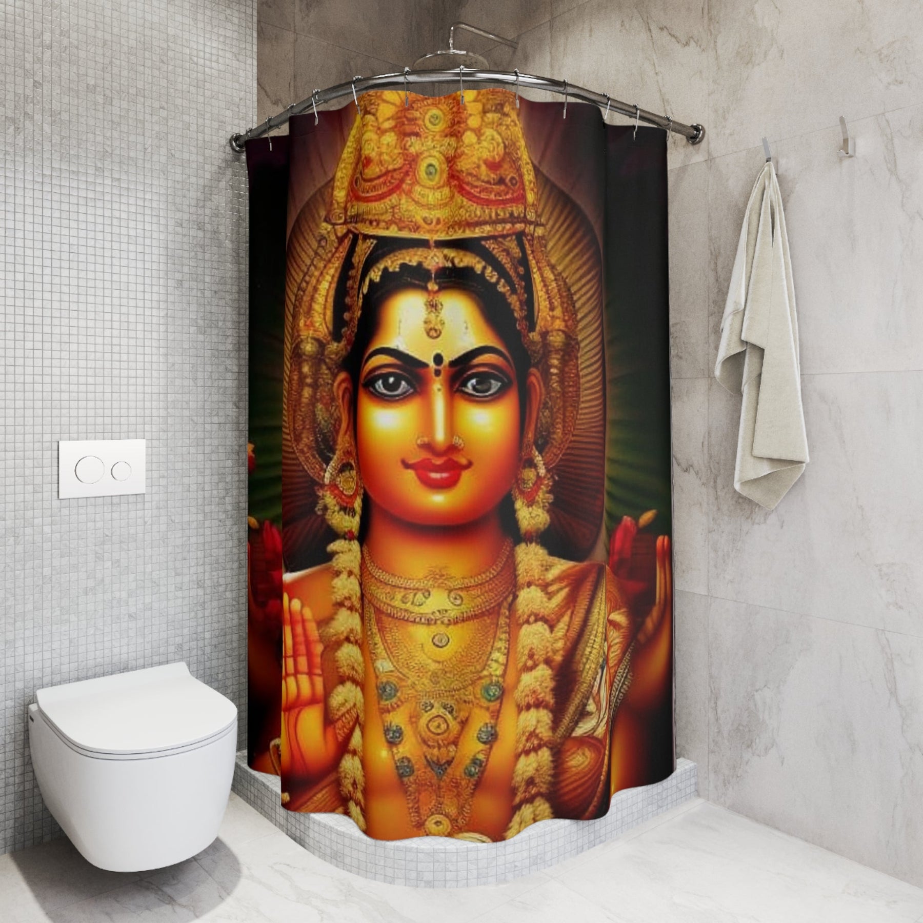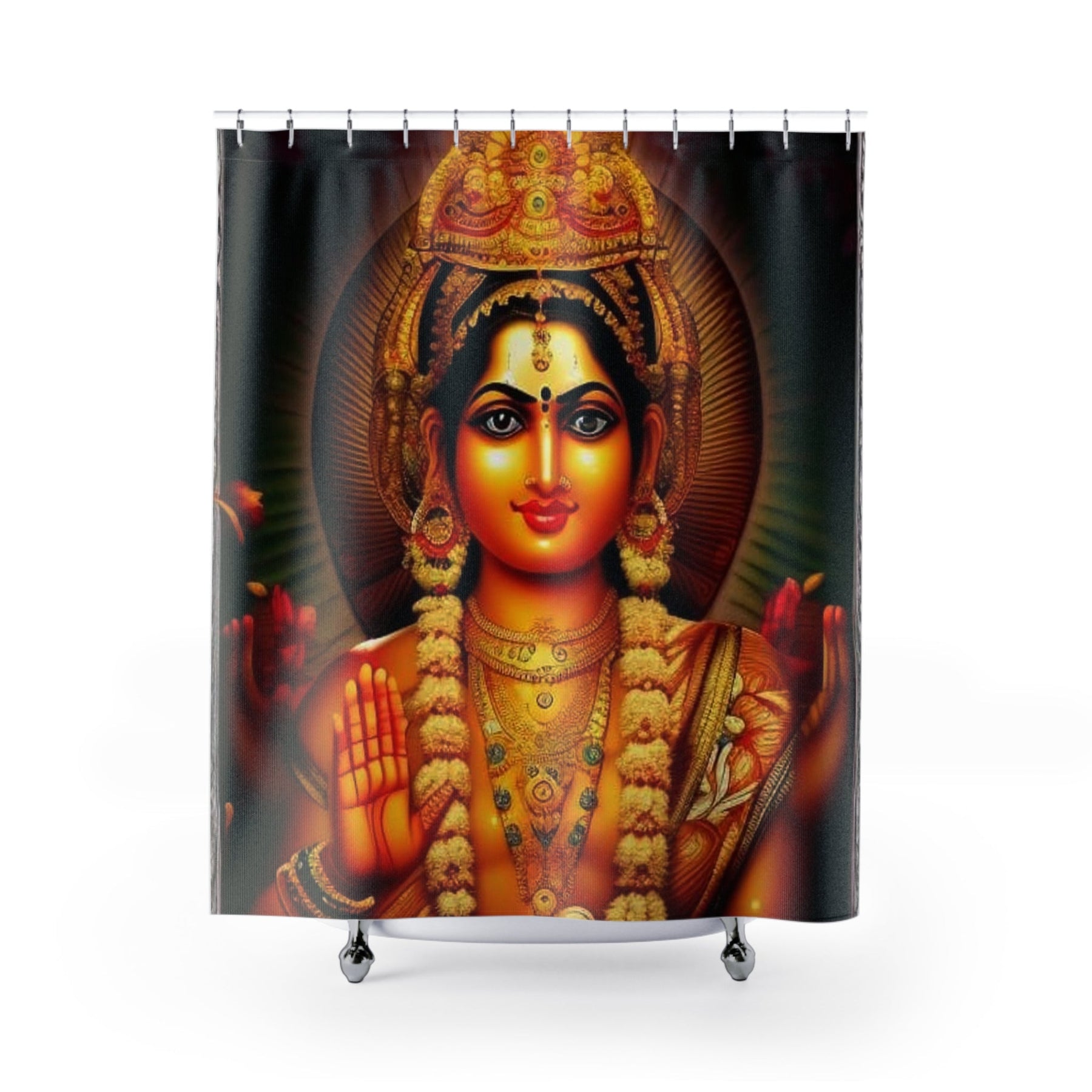 Elevate your bathroom with this beautiful Lakshmi Abundance Shower Curtain. The intricate design adds a touch of elegance and spirituality to your space. Perfect for adults looking to create a serene and peaceful atmosphere in their bathroom. Ideal for Diwali celebrations and spiritual individuals.
