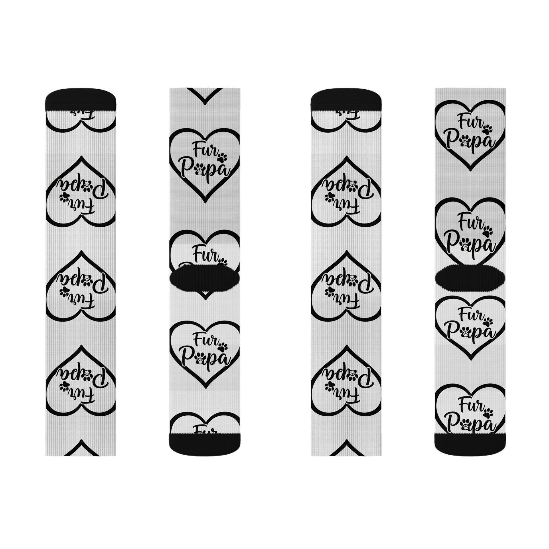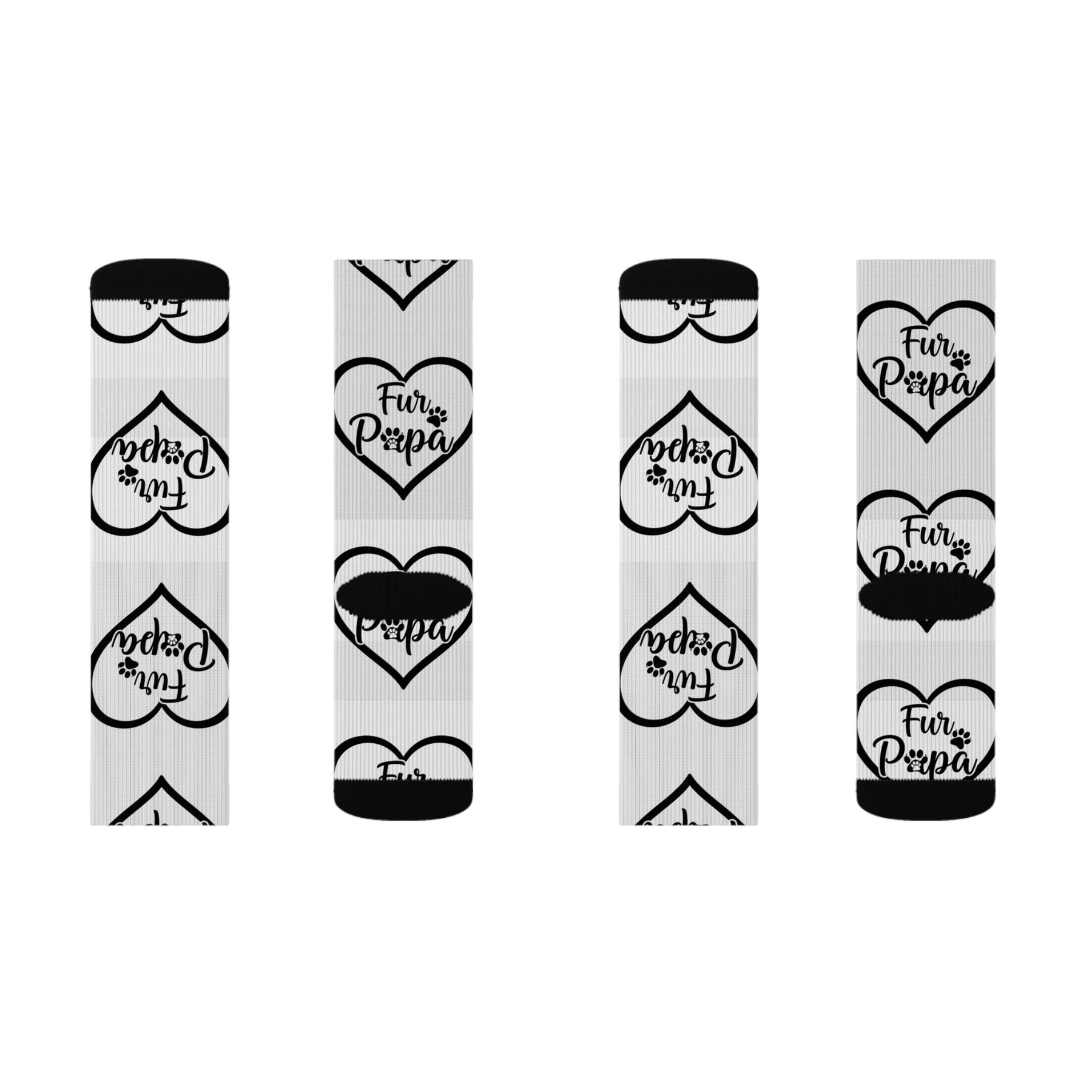 These Fur Papa Sublimation Socks are the perfect gift for dads, especially for Father's Day and special occasions. With a super soft fleece lining, all-over print, and cushioned bottoms, these crew length socks provide excellent protection and warmth. Available in 3 different sizes, these unisex socks have a ribbed tube design. Please note that they are printed with flat sublimation method, so color discrepancy can be seen on side seams.